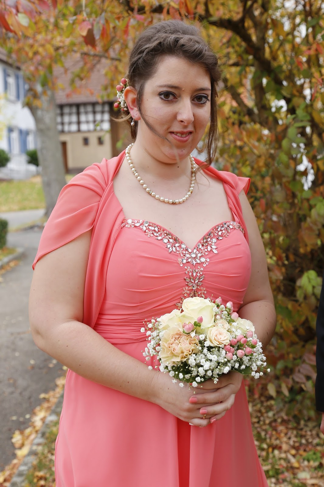 Dieses tolle Brautkleid habe ich im Kleider Müller entdeckt. Normalerweise wollte ich ein rosa farbiges Kleid, leider stand mir das überhaupt nicht. Nach sehr vielen Anproben von verschiedenen Kleidern, ist es dieses korallfarbene Kleid geworden.